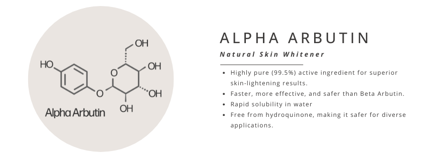 Alpha Arbutin คืออะไร? Alpha Arbutin เป็นสารไวท์เทนนิ่งที่ได้รับความนิยมในวงการเครื่องสำอาง ด้วยความบริสุทธิ์สูงถึง 99.5% สารตัวนี้มีประสิทธิภาพในการยับยั้งการผลิตเมลานินที่เป็นสาเหตุของปัญหาผิวหมองคล้ำ จุดด่างดำ และฝ้า นอกจากนี้ยังมีคุณสมบัติที่โดดเด่นในการลดการระคายเคือง ต้านการอักเสบ และต้านแบคทีเรีย เหมาะสำหรับการใช้งานในผลิตภัณฑ์เพื่อความงามระดับพรีเมียม